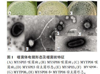 (A)MYSP03噬茵斑;(B)MYSPO8噬茵斑;(C)MY'IT08噬茵斑;(D)MYSP03宿主茵形態(tài);(E)MYSP03;(F)MYSP08;(G)MYrn)08;(H)MYSP08和MYTP08宿主茵形態(tài)。