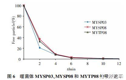 噬菌體純培養(yǎng)液的初始效價為1*109pfu/mL,由吸附速率曲線可知(圖6):當MOI為10℃,15℃溫育2 min就有近80%的MYSP03顆粒吸附到宿主細胞,MYSP08和MYTP08的被吸附數(shù)量也超過了70%。溫育6 min后,3株噬菌體被吸附的顆粒數(shù)量均高達97%,溫育10 min后,混合液中的噬菌體顆粒幾乎全部吸附到了宿主菌細胞上。因此,3株噬菌體對宿主均具有較強的吸附能力。
