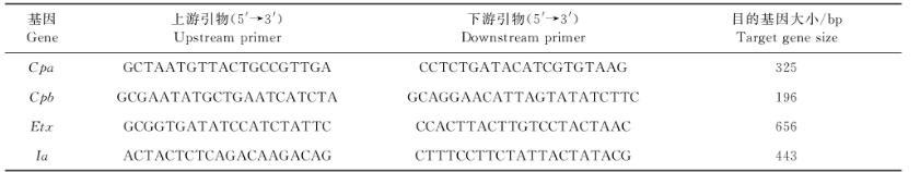 合成產(chǎn)氣莢膜梭菌分型引物(表1)。多重分型PCR體系(50μL):上、下游引物(共4對)各1μL,2×TaqMix酶25μL,模板2μL,去離子水15μL;PCR反應(yīng)程序:94℃預(yù)變性5 min;94℃變性30 s,53℃退火30 s,72℃延伸30 s,共30個循環(huán);72℃終延伸5 min。PCR產(chǎn)物經(jīng)1%的瓊脂糖凝膠電泳鑒定。