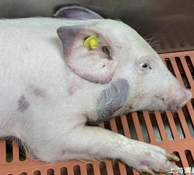 結(jié)果(表3)顯示,以3.5×1010CFU活菌靜脈注射56~63日齡健康易感豬,2只試驗豬在4 d內(nèi)全部死亡,病死豬表現(xiàn)為精神沉郁、喜臥、不愿走動、厭食、頸部出現(xiàn)暗紅色丘疹(圖2)。說明CVCC43005株對豬最小致死劑量為3.5×1010CFU/頭。