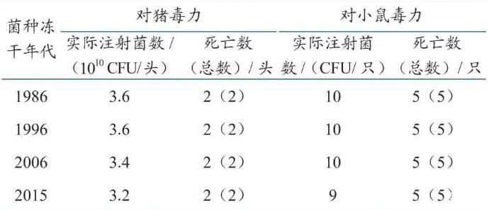 1986、1996、2006、2015年4個凍干代次的CVCC43005株菌種按照最小致死劑量攻擊豬,均可使豬全部死亡,毒力檢定結(jié)果(表4)均符合要求。根據(jù)不同凍干代次CVCC43005株菌種毒力檢定結(jié)果,CVCC43005株菌種毒力檢定標(biāo)準(zhǔn)為取56~63日齡健康易感豬2頭,經(jīng)靜脈注射菌液5.0 mL/頭(活菌濃度不高于7.0×109CFU/mL),觀察4 d,應(yīng)全部死亡;取18~22 g小白鼠5只,經(jīng)皮下注射菌液0.2 mL/只(活菌濃度不高于50 CFU/mL),觀察7 d,應(yīng)全部死亡。