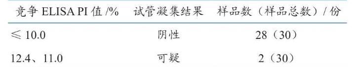 用競爭ELISA方法和試管凝集方法同時檢測30份豬血清中的豬丹毒抗體,將血清抗體PI值≤10.0%的豬判定為抗體陰性豬。結(jié)果(表2)顯示,28頭豬PI值均≤10.0%且試管凝集試驗結(jié)果均為陰性,另外2頭豬PI值分別為12.4和11.0,且試管凝集試驗結(jié)果均為可疑。