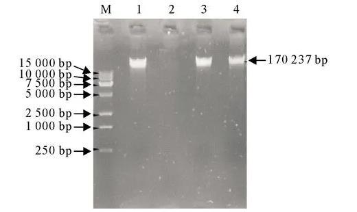 M.DNA標(biāo)準(zhǔn)DL 15 000;1.vB_EcoM-IME540核酸;2.DNaseⅠ;3.RNase A;4.Mung Bean Nuclease