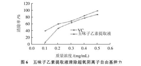 由圖5可知,在0.1~0.5mg/mL的質(zhì)量濃度范圍內(nèi),二者對(duì)羥自由基清除作用較好,并且其清除效果都與其質(zhì)量濃度有一定的關(guān)系,隨質(zhì)量濃度的增加,對(duì)自由基的清除效果增強(qiáng)。另外,總體上五味子乙素提取液對(duì)羥自由基清除作用大于VC,其半數(shù)清除質(zhì)量濃度為0.2mg/mL,當(dāng)質(zhì)量濃度為0.5mg/mL,其清除率接近100%,而抗壞血酸的半數(shù)清除質(zhì)量濃度為0.26mg/mL。