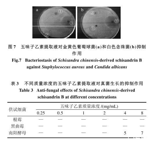 3.2五味子乙素提取液對(duì)金黃色葡萄球菌、白色念珠菌、沙門氏菌、大腸桿菌、枯草芽孢桿菌均有一定的抑制作用,其中對(duì)白色念珠菌和金黃色葡萄球菌的抑制作用最強(qiáng),最低抑菌濃度為0.25mg/mL,對(duì)根霉、黑曲霉、南陽(yáng)酵母無明顯抑菌活性。