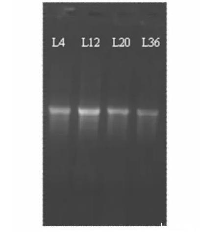 利用天根細菌基因組DNA提取試劑盒(離心柱型)提取菌株的基因組DNA,并采用1.0%瓊脂糖凝膠進行電泳檢測,得到的檢測電泳圖只有1個條帶,如圖4所示,可進行16S rDNA基因序列PCR擴增。