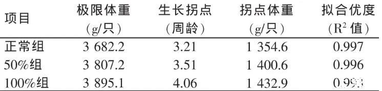 4.3根據(jù)生長曲線估算出,正常組肉鴨的體重為3682.2 g/只,生長拐點為3.21周齡,拐點體重為1354.6 g/只;50%霉變組肉鴨的體重為3807.2 g/只,生長拐點為3.51周齡,拐點體重為1400.6 g/只;100%霉變組肉鴨的體重為3895.1 g/只,生長拐點為4.06周齡,拐點體重為1432.9 g/只。