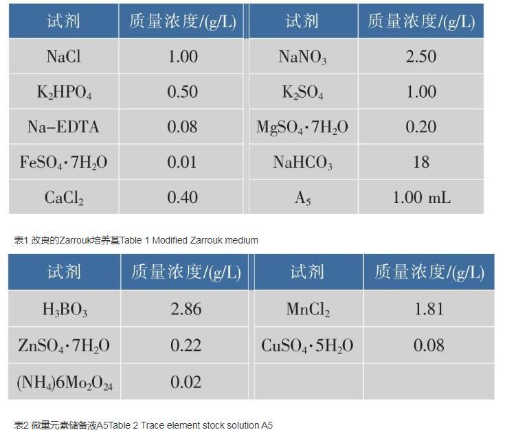 培養(yǎng)基:采用的改良的Zarrouk培養(yǎng)基配方,見表1、表2。