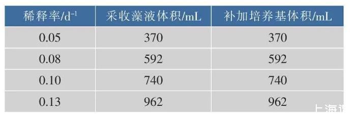 表3不同稀釋率下PBR中每天采收藻液和補加Zarrouk培養(yǎng)基的體積