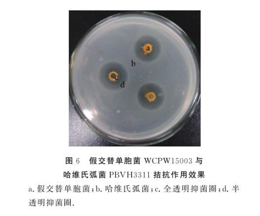 當(dāng)哈維氏弧菌PBVH3311密度為106cfu/mL時(shí),假交替單胞菌WCPW15003的最小抑菌密度為107cfu/mL,抑菌圈直徑為(18.15±0.09)mm;當(dāng)哈維氏弧菌PBVH3311密度為107、108cfu/mL時(shí),假交替單胞菌WCPW15003的最小抑菌密度均為108cfu/mL,抑菌圈直徑分別為(18.53±1.34)、(11.68±2.58)mm。拮抗作用效果為全透明抑菌圈,外側(cè)還有一圈半透明抑菌圈(圖6)。