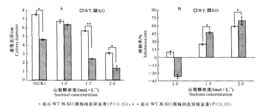 由圖1可以看出,在1.0 mol/L山梨醇脅迫條件下,KO菌株與WT菌株的菌落生長(zhǎng)速度沒有顯著差異,但在1.5和2.0 mol/L山梨醇脅迫條件下,KO菌株的菌落生長(zhǎng)速度都顯著低于WT菌株,表明KO菌株對(duì)較高濃度山梨醇的滲透脅迫比WT菌株更敏感。