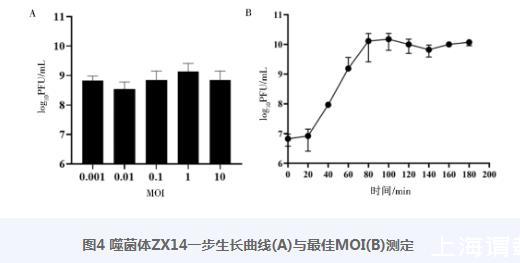 圖4噬菌體ZX14一步生長曲線(A)與最佳MOI(B)測定
