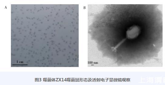 圖3噬菌體ZX14噬菌斑形態(tài)及透射電子顯微鏡觀察