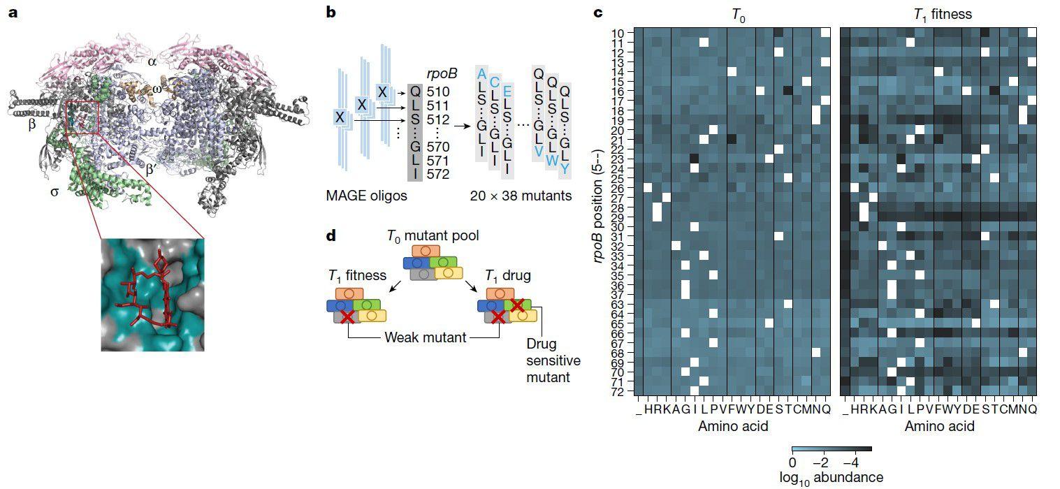 圖1、在Rif結合位點生成所有單個密碼子替換。a,大腸桿菌RNAP的rpoB亞基內的Rif結合位點(藍色),在下圖中放大(PDB 5UAC)。b,突變池生成的示意圖。MAGE寡核苷酸設計為在Rif結合位點內生成760個單密碼子突變體(20個取代×38個位點)的飽和庫。c,適應性篩選后在時間點0(T0)和時間點1(T1)生成的突變豐度的代表性熱圖。對于篩選數據的分析,通過計算log2(T1 fitness/T0)倍數變化,在T1和T0之間進行歸一化。行對應于rpoB位置510–537和563–572;列對應于氨基酸。白色方塊表示野生型殘基。d,藥物敏感性和耐藥性篩選示意圖。在LB中無法生長的突變體被指定為弱突變體,而僅在藥物中無法生長的突變體被認為對藥物敏感。通過將“T1藥物”突變豐度標準化為“T1適應性”,即log2(T1藥物/T1適應性),可以分離藥物特異性作用。