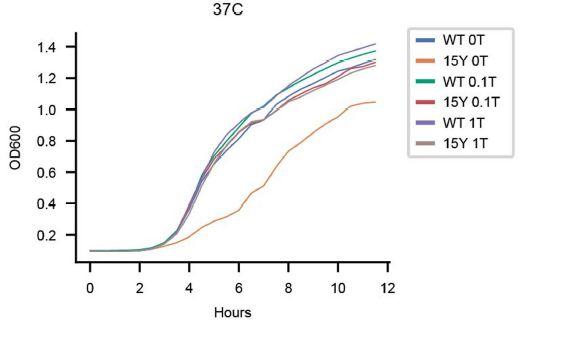 圖5、rpoB 515Y突變體與野生型細胞在添加0、0.1或1μg/mL胸腺嘧啶(thymidine)條件下的生長曲線。數(shù)值代表2個生物學重復的平均值。