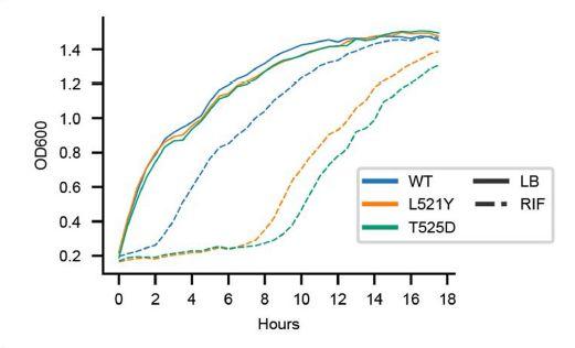 圖4、使用Bioscreen全自動生長曲線分析儀對利福平超敏感突變體(hypersensitive mutants)在80μg/mL利福平處理1小時后的恢復情況進行了生長曲線分析。測量了這些突變體在經(jīng)過利福平處理后的生長恢復情況,以評估其對藥物的敏感性。