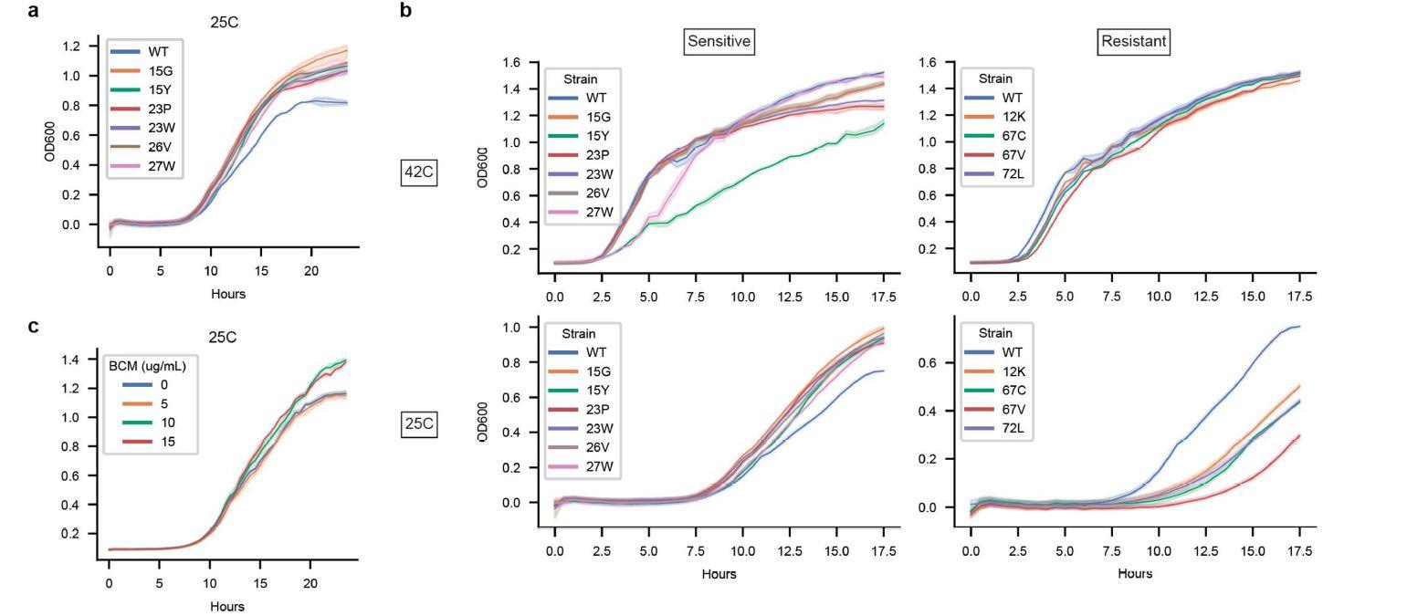 圖3、利福平結合位點突變體的生長特性及與平均位置特性的進化保守性比較。a,在25°C下生長的5-氟尿嘧啶敏感突變體的生長曲線。b,按5-氟尿嘧啶敏感性分層的rpoB突變體在25°C和42°C下的生長曲線。c,在25°C下生長的野生型細胞添加亞抑制濃度的雙環(huán)霉素的生長曲線。除非另有說明,生長曲線代表n=3個生物學獨立實驗的平均值,誤差條表示95%置信區(qū)間。