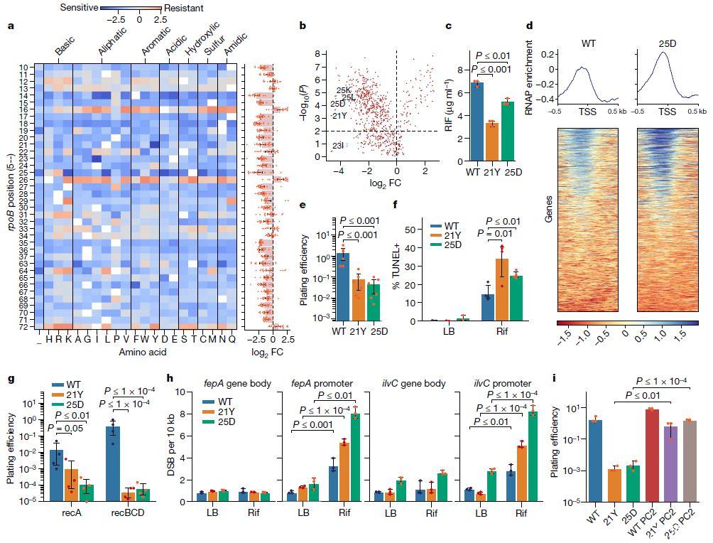 圖2、Rif對一類新型超敏突變體的殺菌作用。a,rpoB突變體對Rif的敏感性和抗性圖譜。b,a中數(shù)據(jù)的火山圖。終止密碼子為灰色。c,超敏突變體中Rif的MIC(P=1.2×10?4,從左到右為2.1×10?3)。d,用80μg ml-1 Rif處理1小時后恢復1小時后,來自野生型(WT)和rpoB T525D RNAP在高度轉(zhuǎn)錄基因轉(zhuǎn)錄起始位點(TSS)周圍ChIP-seq信號的薈萃分析。e,80μg ml-1 Rif處理1小時后超敏突變體的接種效率(n=6;P=5.7×10?4、1.8×10?4)。f,用80μg ml-1 Rif處理1小時后,通過TUNEL染色測量超敏突變體的DNA損傷。TUNEL陽性細胞是在超過99%的未處理細胞中檢測到的超過信號的細胞百分比(n=4;P=1.3×10?2、4.7×10?3)。g,80μg ml-1 Rif處理1小時后recA或recBCD敲除菌株中超敏突變體的接種效率(n=4,P=5.3×10-2,7.3×10-3,4.2×10-5,5.7×10-5)。h,用80μg ml-1 Rif處理1小時后,使用SLR-qPCR測量的啟動子和基因體上每10千克堿基(kb)的DSB數(shù)(P=2.4×10-3、1.7×10-5、1.2×10-4、3.7×10-3、2.4×10-5、4.2×10-5)。i,超敏突變體在含有復制蛋白dnaC的溫度敏感等位基因的PC2背景中的接種效率(P=1.8×10-3、7.6×10-5)。通過將細胞移至42°C 1.5小時,然后用80μg ml-1 Rif處理30分鐘來阻斷復制。