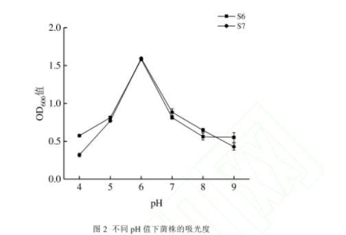 隨著pH值由4增加到9,2株葡萄球菌的生長(zhǎng)能力均呈現(xiàn)先增加后下降,在pH值為6時(shí)生長(zhǎng)能力最強(qiáng),其OD600值均達(dá)到1.5以上,在pH值4~5,2株葡萄球菌能較好生長(zhǎng),說明其能適應(yīng)偏酸性的發(fā)酵環(huán)境,具有作為鲊肉粉發(fā)酵劑的潛力。