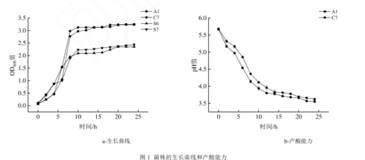 a-生長(zhǎng)曲線;b-產(chǎn)酸能力圖1菌株的生長(zhǎng)曲線和產(chǎn)酸能力
