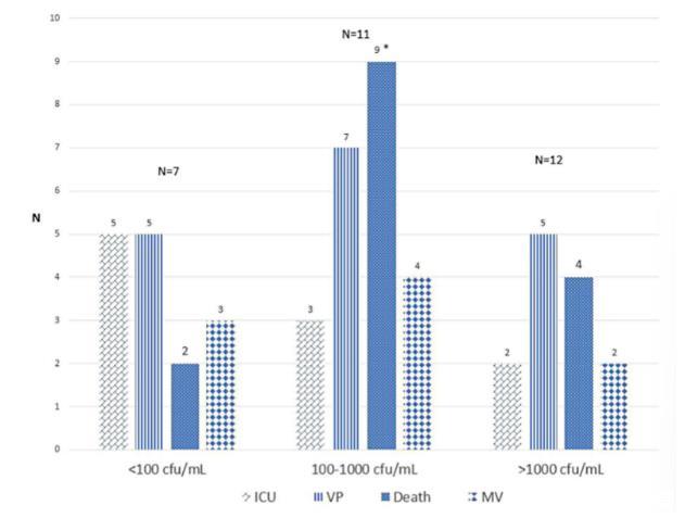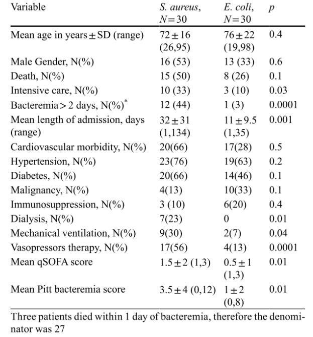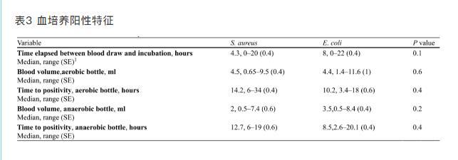 本文進(jìn)一步比較了3種細(xì)菌載量的臨床預(yù)后。對(duì)于金黃色葡萄球菌菌血癥,細(xì)菌載量在100~1000 CFU/mL時(shí)患者死亡率顯著增加。而大腸桿菌無顯著變化。
