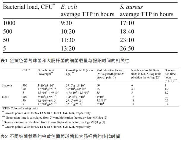 表1金黃色葡萄球菌和大腸桿菌的細(xì)菌載量與報(bào)陽時(shí)間的相關(guān)性表2不同細(xì)菌載量的金黃色葡萄球菌和大腸桿菌的傳代時(shí)間02