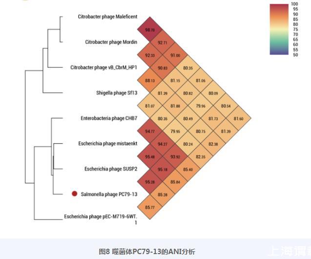 噬菌體PC79-13基因組序列全長為86 886 bp(GenBank登錄號(hào)為OR687644.2),在其基因組中未發(fā)現(xiàn)mcr-1(黏菌素耐藥基因),qnr(喹諾酮類耐藥基因),sul1、sul2、sul3(磺胺類耐藥基因),floR(氯霉素抗性基因),同時(shí)不含有過敏原相關(guān)基因,因此在生物安全上不存在隱患。根據(jù)NCBI數(shù)據(jù)庫BLAST核苷酸序列比對(duì)結(jié)果,噬菌體PC79-13的基因組DNA與大腸桿菌噬菌體SUSP2的基因組DNA高度相似(相似性96.67%,覆蓋率94%,登錄號(hào)NC 028935.2),同時(shí)與大腸桿菌噬菌體CHB7的基因組DNA相似度也較高(相似性96.65%,覆蓋率91%,登錄號(hào)MK562504.1)?;谌蚪M進(jìn)化樹分析比對(duì)(圖7)可知噬菌體PC79-13與大腸桿菌SUSP2親緣性最高,屬于同一分支,即雙鏈DNA病毒域,香港病毒界,有尾噬菌體門,有尾噬菌體目,肌尾噬菌體科,是一株未被發(fā)現(xiàn)的噬菌體。用OrthoANI算法對(duì)噬菌體PC79-13進(jìn)行分析,熱圖(圖8)顯示其與大腸桿菌SUSP2有最高同一性95.28。