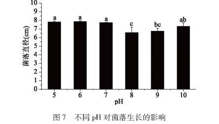 由圖7可以看出,pH在5.0~10.0范圍內該菌均能生長,但在不同pH下菌落直徑存在差異,pH在5.0~7.0范圍內菌落直徑差異不顯著,在8.0~10.0范圍內菌落直徑存在顯著性差異;菌絲生長更適合偏酸性環(huán)境,pH為6.0時菌落直徑最大,說明在pH6.0下菌絲生長速率相對最快;當pH高于6.0時,菌絲還會生長,且隨著pH的升高,菌落直徑差異顯著,但都低于同培養(yǎng)天數(shù)下pH6.0時的菌落直徑。綜上,pH對該致病菌生長影響明顯,偏酸性的環(huán)境更有利于該菌的生長,以pH6.0最佳。