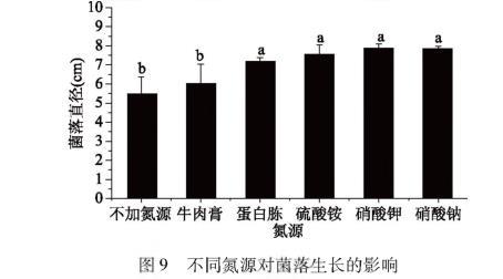 相同的培養(yǎng)時(shí)間,菌落直徑與不同氮源的關(guān)系如圖9所示。