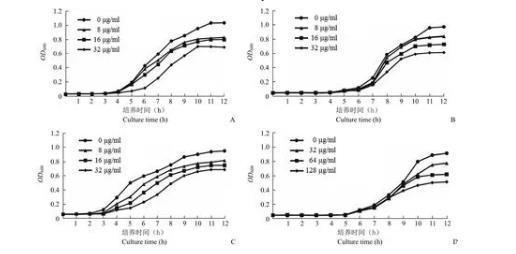 圖1小檗堿對(duì)腸道菌生長(zhǎng)曲線的影響(A:金黃色葡萄球菌;B:弗氏志賀菌;C:痢疾志賀菌;D:沙門菌)