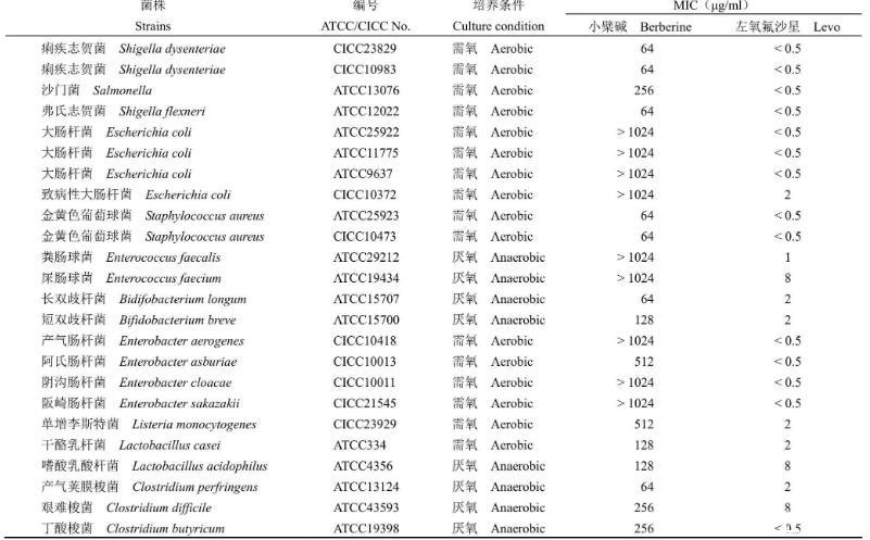 表1小檗堿對(duì)不同腸道菌群的抑制作用