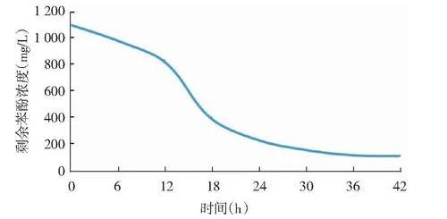 每6個(gè)小時(shí)取樣培養(yǎng)液,測(cè)定剩余的苯酚濃度。以培養(yǎng)時(shí)間為橫坐標(biāo),剩余苯酚濃度為縱坐標(biāo),繪制苯酚降解曲線(xiàn)。如圖7所示,結(jié)果表明:培養(yǎng)時(shí)間越長(zhǎng),苯酚濃度越低,降解率隨之升高。培養(yǎng)到42h時(shí),剩余苯酚濃度為104mg/L,苯酚降解率高達(dá)90.5%,說(shuō)明菌株Y_1具有較強(qiáng)的降酚能力,達(dá)到高效降酚菌的標(biāo)準(zhǔn)。