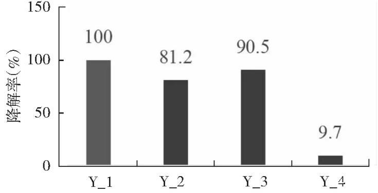 篩選出4株能以苯酚為唯一碳源生長(zhǎng)的菌株,且對(duì)苯酚的耐受濃度均能達(dá)到1 500mg/L,分別命名為Y_1、Y_2、Y_3和Y_4。將4株菌在同一條件下培養(yǎng):苯酚濃度800 mg/L、pH 7.2、接種量4%、溫度32℃、搖床轉(zhuǎn)速180 r/min,振蕩培養(yǎng)30 h取樣測(cè)定培養(yǎng)基苯酚濃度。4株菌對(duì)苯酚的降解情況見(jiàn)圖1。由此可見(jiàn),菌株Y_1的生長(zhǎng)情況和降酚能力優(yōu)于其他菌株。