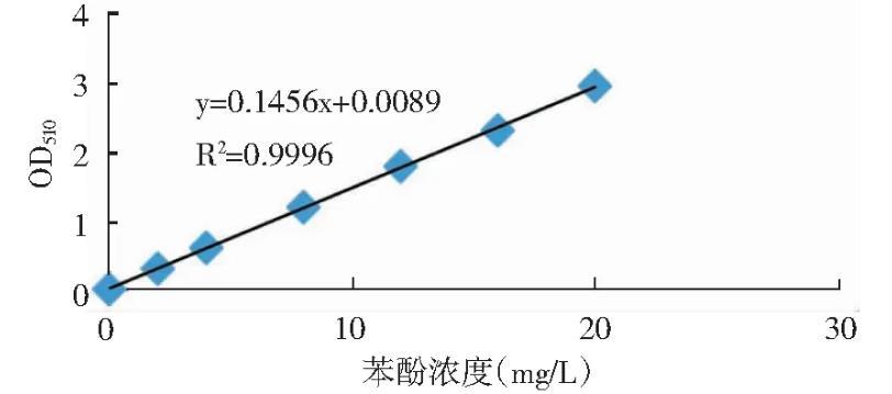 以苯酚濃度為橫坐標(biāo),以吸光度(λ=510)為縱坐標(biāo),繪制苯酚濃度標(biāo)準(zhǔn)曲線(xiàn)。如圖6所示。該苯酚濃度標(biāo)準(zhǔn)曲線(xiàn)表明,當(dāng)波長(zhǎng)等于510 nm時(shí),苯酚濃度范圍在2~20 mg/L之間,吸光度值Y和苯酚濃度X,滿(mǎn)足線(xiàn)性方程Y=0.1456X+0.0089,R2=0.9996,表明二者呈良好的線(xiàn)性關(guān)系。