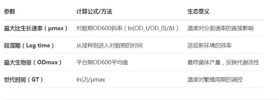 通過生長曲線計算以下參數(shù),定量比較溫度影響: