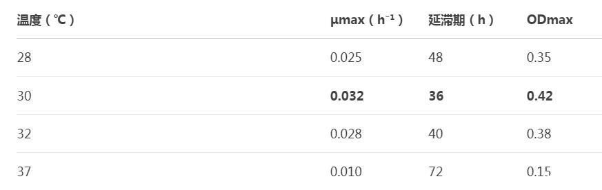 綜合指標:選擇μmax最高且ODmax穩(wěn)定的溫度區(qū)間。