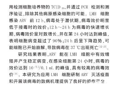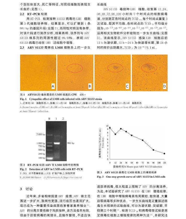 結(jié)果顯示,ARV S1133毒株能夠在LMH細(xì)胞中很好地增殖,并出現(xiàn)典型的CPE。一步生長曲線結(jié)果顯示,S1133感染LMH細(xì)胞后的前12 h為潛伏期,12 h^24 h為快速增長期,第24小時(shí)的效價(jià)達(dá)到最大,TCID50為10-9.2/0.1 m L。本研究為進(jìn)一步研究ARV的致病機(jī)理和研制細(xì)胞滅活疫苗提供了良好的操作平臺。