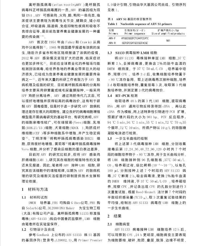 為研究禽呼腸孤病毒(ARV)在雞肝癌細(xì)胞(LMH)中的增殖特性,本研究將ARV S1133毒株感染LMH細(xì)胞,連續(xù)傳代3次,觀察細(xì)胞病變(CPE),通過RT-PCR鑒定病毒,并進(jìn)一步研究病毒的增殖特性。