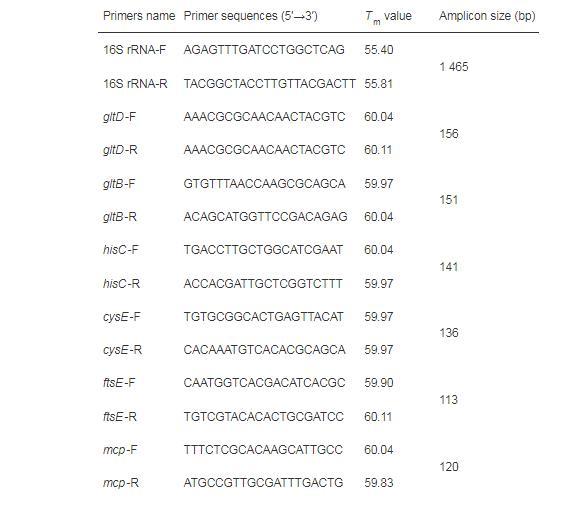 為驗(yàn)證測(cè)序結(jié)果的準(zhǔn)確性,選取顯著上調(diào)和下調(diào)基因各6個(gè),進(jìn)行RT-qPCR驗(yàn)證試驗(yàn)。將這些待驗(yàn)證的基因序列上傳至NCBI數(shù)據(jù)庫(kù),使用Primer-BLAST功能設(shè)計(jì)目的基因引物(表1),并由浙江尚亞生物技術(shù)有限公司合成。采用反轉(zhuǎn)錄試劑盒將RNA反轉(zhuǎn)錄為cDNA,以此為模板,以16S rRNA基因?yàn)閮?nèi)參基因,進(jìn)行RT-qPCR試驗(yàn)。反應(yīng)體系(10μL):SYBR Mix 5μL,上、下游引物(10μmol/mL)各0.4μL,cDNA模板1μL,ddH2O 3.2μL。反應(yīng)程序:95℃預(yù)變性10 min;95℃變性10 s,55℃退火10 s,72℃延伸30 s,45個(gè)循環(huán)。采用熔解曲線分析產(chǎn)物特異性。