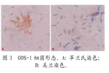 圖3 ODS-1細(xì)菌形態(tài)。A:革蘭氏染色;B:美蘭染色。