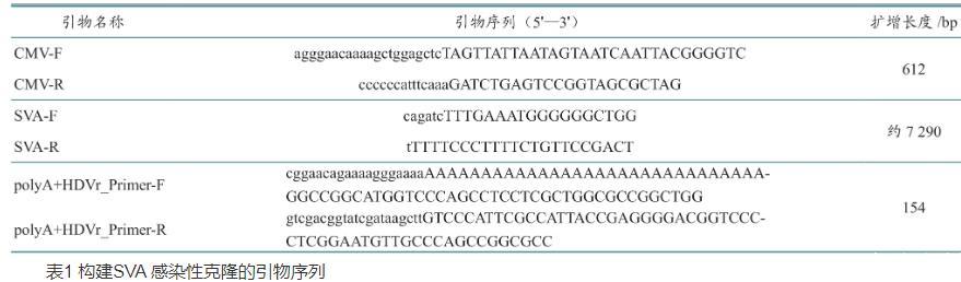 1.2.1引物設計構建方案如下:以EGFP N2質粒為模板,設計含有同源臂的CMV啟動子引物,以SVA-GXT91 RNA為模板設計含同源臂SVA基因全長引物(表1)。含同源臂的poly(A)尾巴+HDVr,由引物自結合擴增形成。