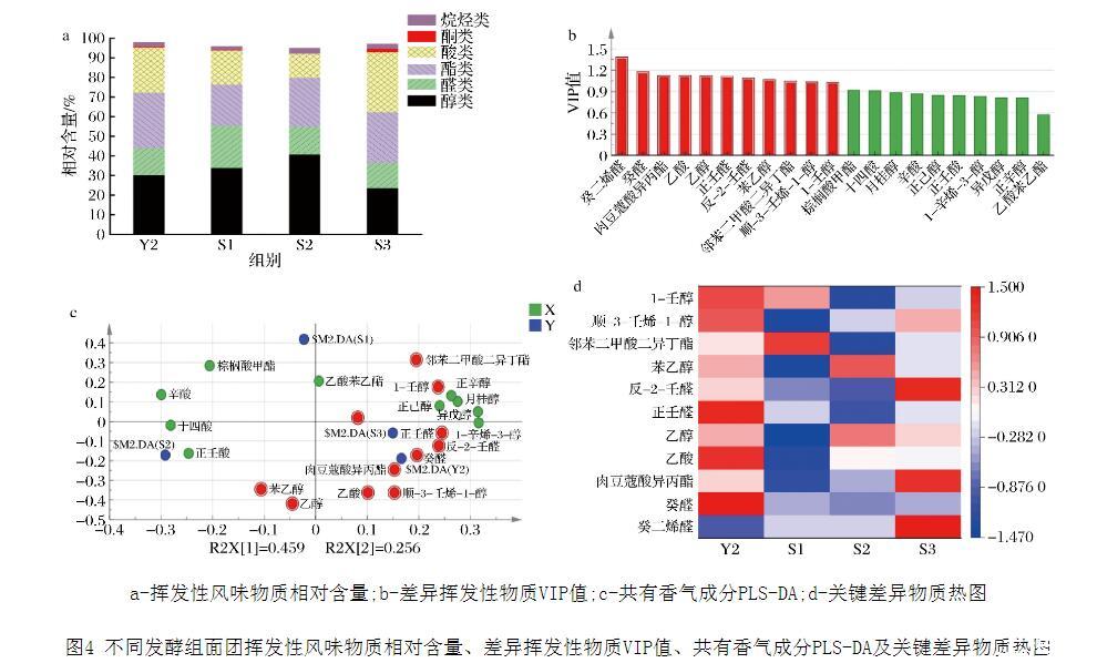 a-揮發(fā)性風味物質相對含量;b-差異揮發(fā)性物質VIP值;c-共有香氣成分PLS-DA;d-關鍵差異物質熱圖