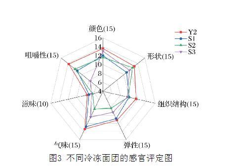 在冷凍面團中,酵母活性的喪失和面團結構的破壞是面團品質下降的主要原因。而冷凍生坯面團在產氣快、活性強的耐冷凍酵母作用下能夠在二次醒發(fā)過程中快速成型,維持產品良好的柔軟質地和彈性。將耐凍產香酵母Y2與3種市售酵母菌劑(標記為S1~S3),在相同條件下(相同添加方式、相同數量級)制備成面團,經40 d冷凍后取出,二次醒發(fā)后從顏色、結構、風味等方面進行感官評價,結果如圖3所示。由于冷凍帶來的影響,各組面團老化程度不同,普遍存在表皮皺縮、凹陷,容易掉碎屑等現象,色澤不均勻、口感粗糙等問題,品質感官劣變。其中酵母Y2感官評價總分為84.2分顯著高于其余3組,尤其在咀嚼性、組織結構上明顯優(yōu)于市售普通酵母菌,說明耐凍酵母菌株對于面團冷凍后的劣變具有改善作用,能夠減少低溫環(huán)境下對面團組織結構、水分遷移造成的影響,在二次醒發(fā)過程中能夠提升一定的感官特性。