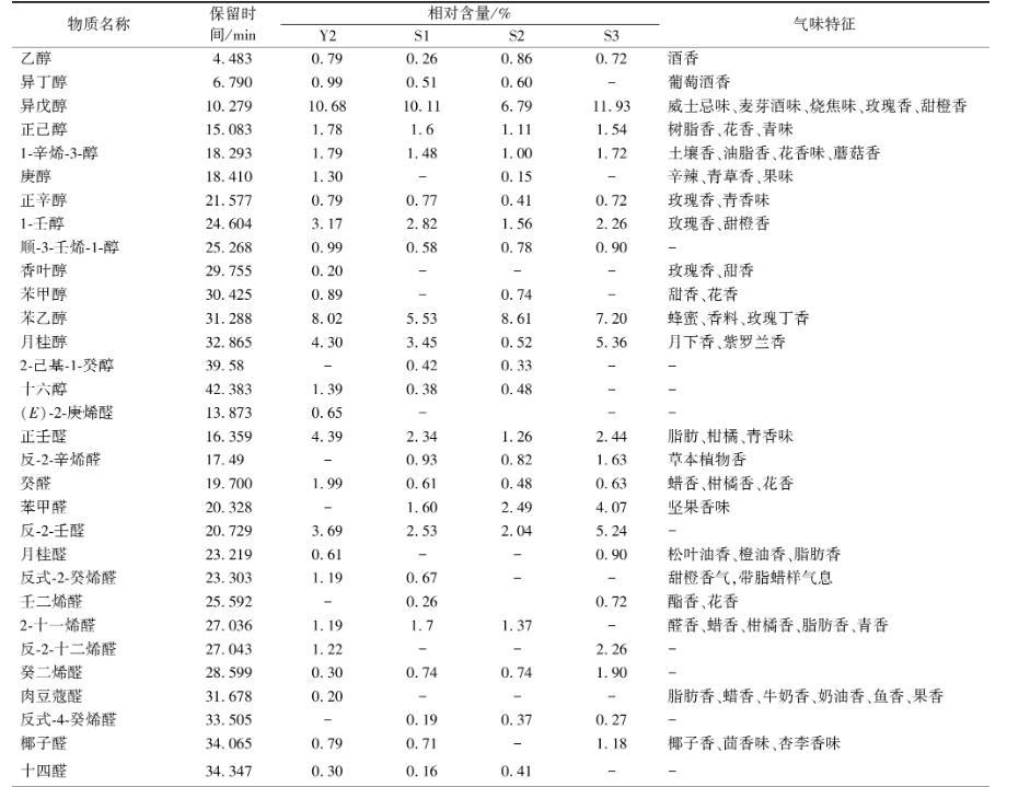 由圖4-a及表3可知,在冷凍面團香氣物質中,醇類、酯類和酸類物質含量較高。酵母菌通過Ehrlich代謝途徑及醛類物質氧化可生成醇類物質,通常具有酒香味及清香味,酸類化合物則是某些風味物質的前體。醇類風味化合物在S2樣本中占比最高達到40.67%,酸類物質在S3樣本中占比達到30.51%。而酯類化合物由酸和醇的酯化反應產生,該類風味物質閾值低,大多具有花、果的芳香氣味,含量較低的情況下也對香氣具有較大貢獻。Y2樣本酯類風味化合物含量占28.39%,高于其他樣本。醛類化合物一般來說在低濃度時對氣味起到積極作用,濃度較高時則會產生令人不悅的異味。酮類、烷烴類化合物由脂質的氧化分解形成,對香氣基本無貢獻,在面團中占比較低。