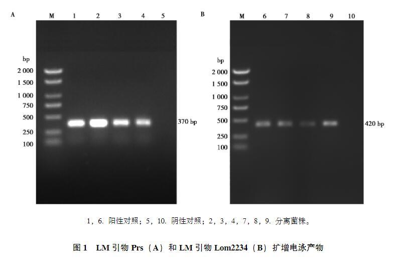 單增李斯特菌PCR鑒定:所有分離株均經(jīng)Prs引物擴增得到約370bp片段(圖1A),Lom2234引物擴增得到約420bp片段(圖1B),確認為LM。