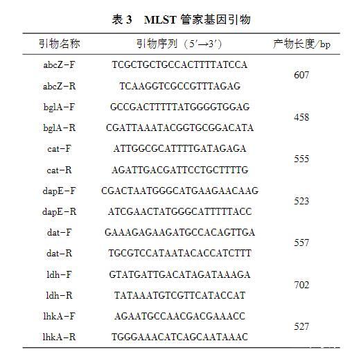 多位點序列分型(MLST):根據(jù)巴斯德研究所網(wǎng)站(網(wǎng)址略)提供的7個管家基因(abcZ,bglA,cat,dapE,dat,ldh,lhkA)設計引物(引物序列詳見表3)。提取分離株DNA作為模板進行PCR擴增。PCR產(chǎn)物測序,測序結果在巴斯德研究所MLST數(shù)據(jù)庫中進行比對以確定菌株序列型(ST)和克隆群(CC)。