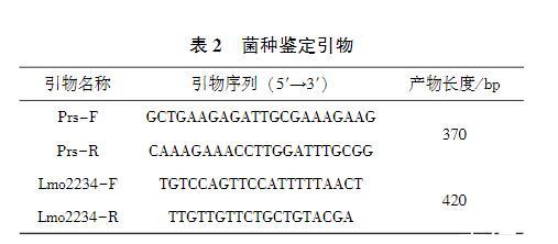 菌株分離鑒定:參考國標GB 4789.30-2016方法進行分離培養(yǎng)。樣品經(jīng)LB1增菌(30℃,22-26h),轉接LB2增菌(30℃,22-26h)。取增菌液劃線接種于PALCAM培養(yǎng)基和LM顯色培養(yǎng)基上(37℃,24-48h)。挑取可疑菌落接種TSB培養(yǎng)基過夜培養(yǎng)后,提取DNA。以DNA為模板,先用李斯特菌屬通用引物Prs進行PCR擴增(預期片段370bp),再將PCR陽性產(chǎn)物用LM特異性引物Lom2234進行PCR擴增(預期片段420bp),經(jīng)瓊脂糖凝膠電泳鑒定確認LM。ATCC19115作為陽性對照,ddH2O作為陰性對照。引物序列詳見表2。
