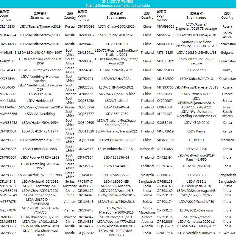 采用病毒基因組DNA/RNA提取試劑盒提取第4代細(xì)胞上清DNA,并使用引物GPCR-F/GPCR-R檢測病毒(引物序列見表1),回收目的基因,送生工生物工程(上海)股份有限公司測序。利用生物信息學(xué)軟件DNAStar7.0和MEGA6分析測得的GPCR基因序列,與其它分離毒株(見表2)使用MEGA7中的Clustal W對核苷酸進(jìn)行比較比對及遺傳進(jìn)化分析并使用TVBOT進(jìn)行美化。核苷酸相似性比對的百分比由DNASTAR(Lasergene Inc.,Madison,USA)的MegAlign程序生成。使用MEGA 7進(jìn)行系統(tǒng)發(fā)育分析,并使用最適合數(shù)據(jù)集的模型構(gòu)建最大似然樹。系統(tǒng)發(fā)育關(guān)系的可靠性評價(jià)采用bootstrap分析與1 000個重復(fù)。