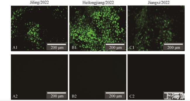 A1、B1、C1.分別為接種LSDV/Jiling/2022、LSDV/Heilongjiang/2022以及LSDV/Jiangxi/2022試驗(yàn)組;A2、B2、C2.陰性對照組