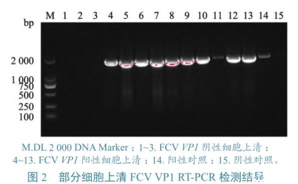 2.2.1分離及鑒定將53份樣品的細(xì)胞上清液進(jìn)行FCVVP1基因PCR鑒定,發(fā)現(xiàn)共有31份細(xì)胞上清出現(xiàn)2 010 bp左右目的條帶(圖2),與預(yù)期片段大小相符。53份樣品的FCV分離率為58.49%(31/53),其中寵物醫(yī)院樣品分離率為46.67%(14/30),貓舍樣品分離率為73.91%(17/23)。